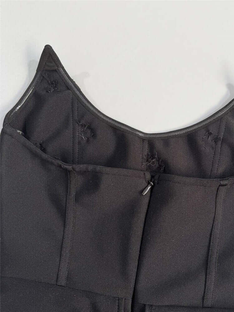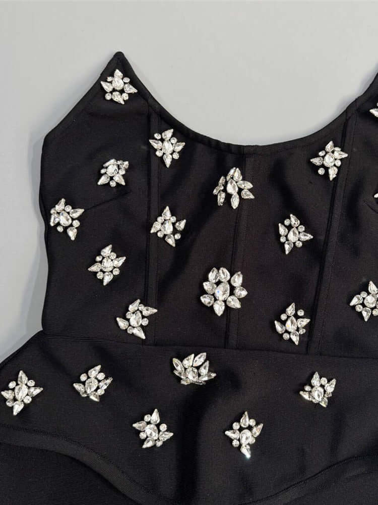 close-up of black bandage gown with crystal embellishments
