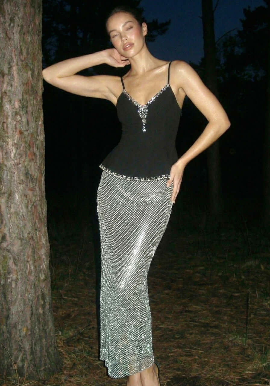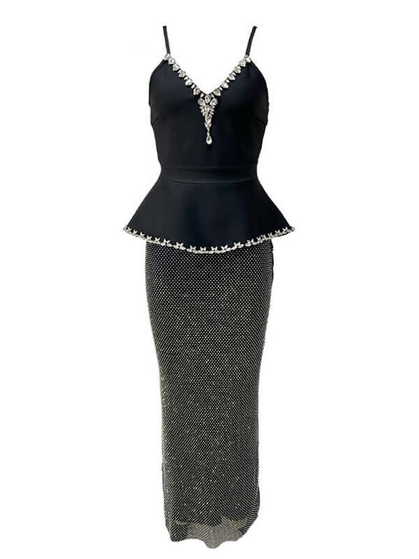 This elegant black peplum gown features a crystal-embellished neckline and a shimmering silver mesh maxi skirt that creates a stunning mermaid-inspired silhouette. Designed to sparkle in natural daylight or evening lighting, it’s perfect for formal events, celebrations, and luxury occasions. The fitted shape and detailed embellishments deliver a glamorous yet sophisticated look.