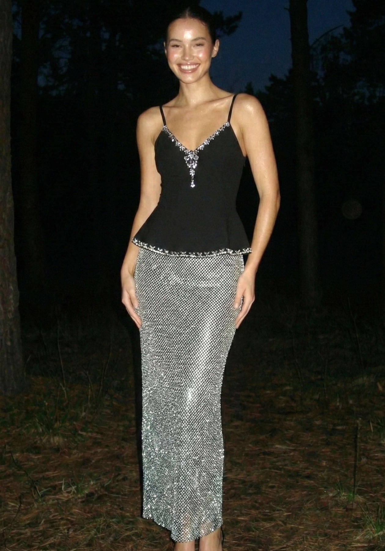 “Black crystal peplum dress with silver mesh skirt on model outdoors