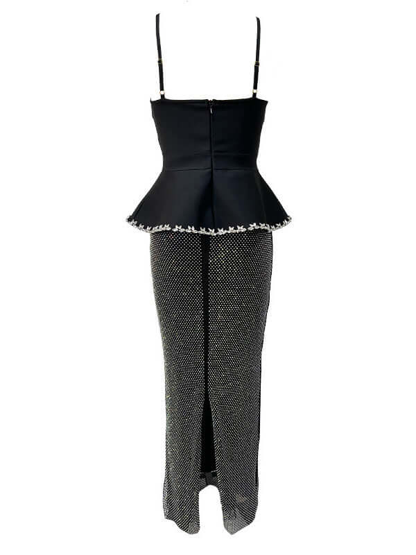 Black Crystal Peplum Mermaid Dress – Silver Mesh Maxi Gown