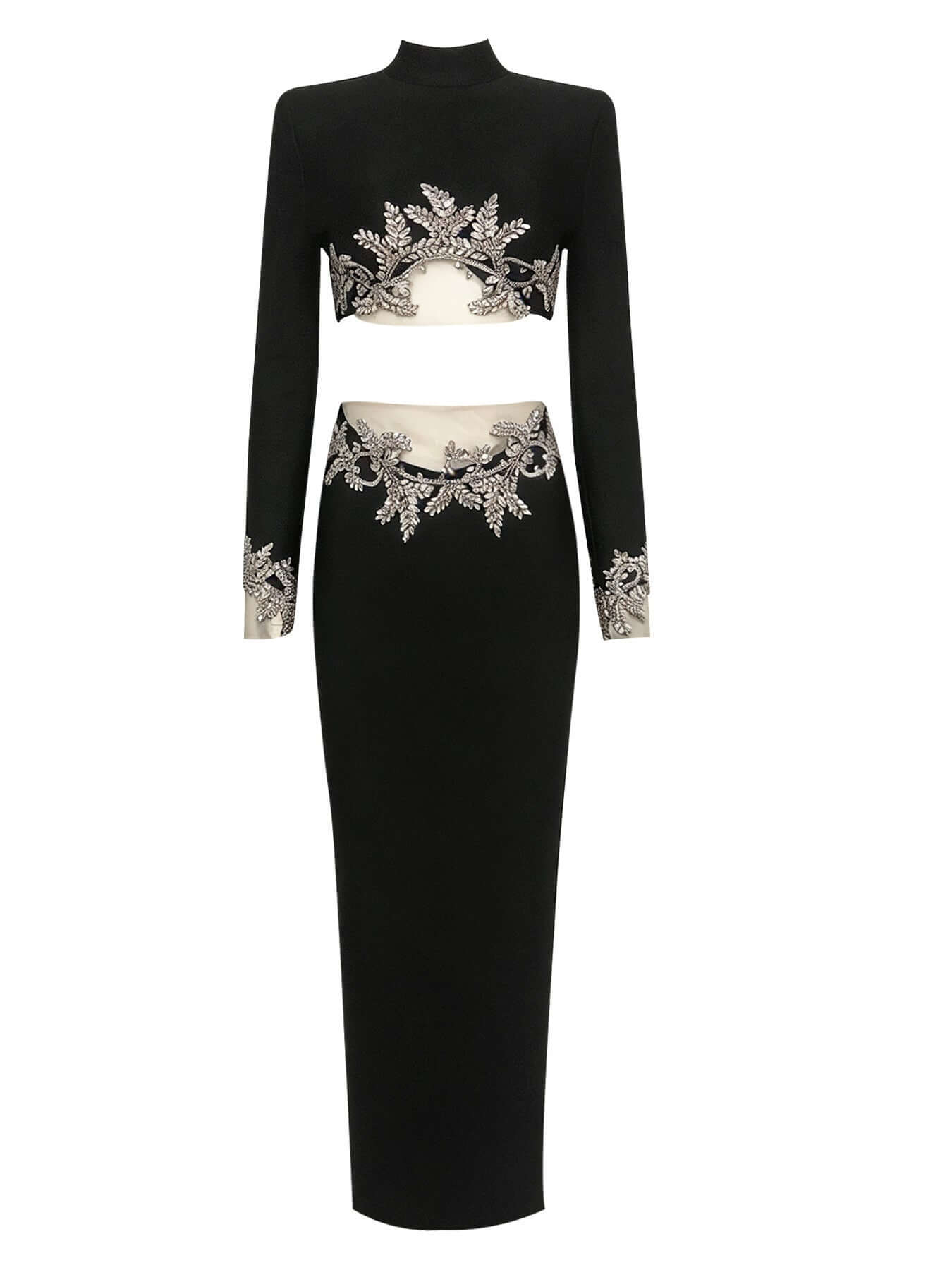 Make a breathtaking entrance in this black embellished two-piece evening gown set, featuring intricate crystal appliqué over sheer cutout panels for a stunning sculpted effect. The long-sleeve crop top and sleek maxi skirt create a bold yet elegant silhouette perfect for galas, red-carpet events, and luxury celebrations. A show-stopping design that blends modern glamour with couture-level detail.