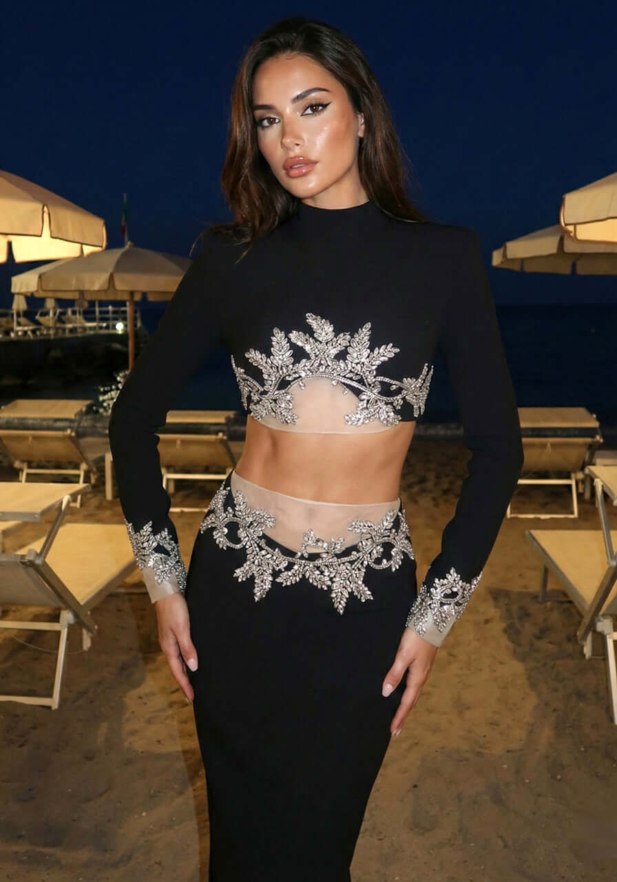 Model wearing black embellished sheer cutout two-piece evening gown set on the beach at night
