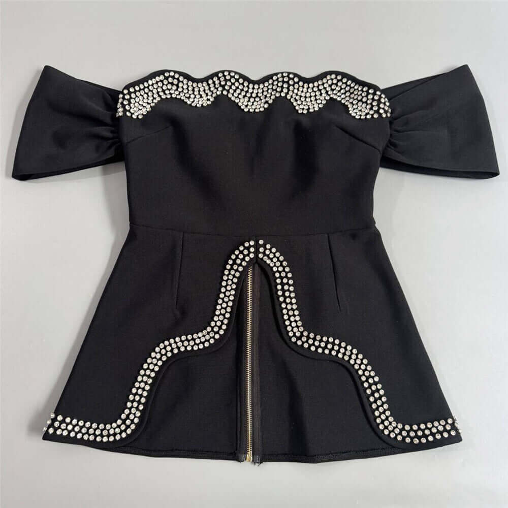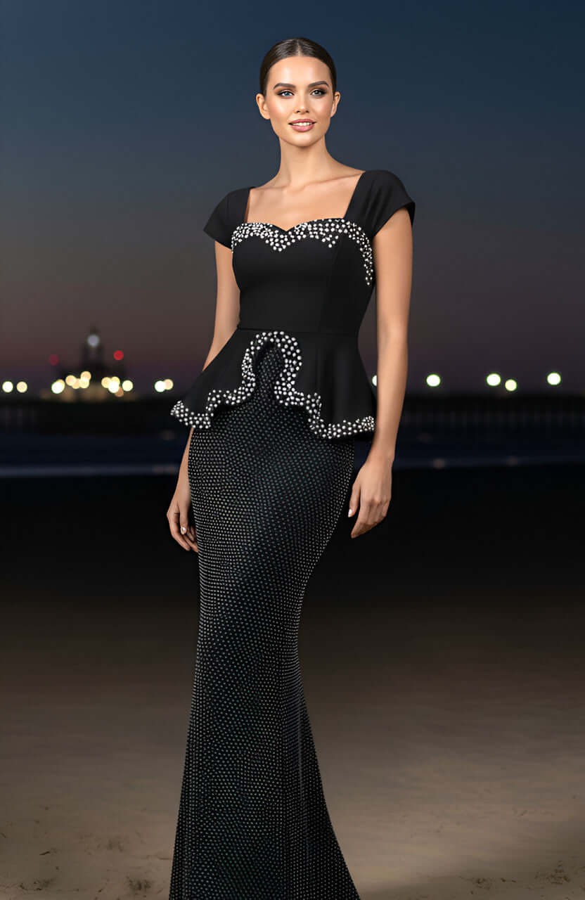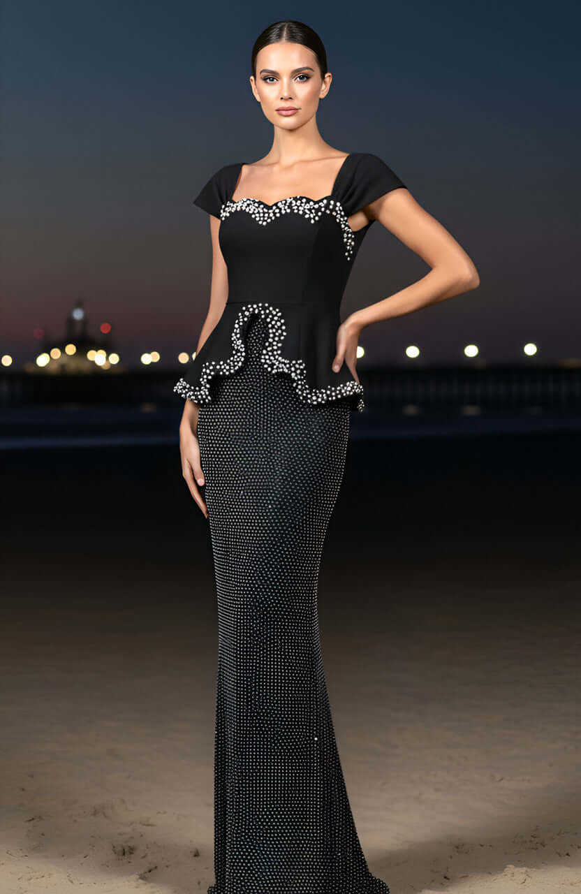 This luxurious black evening gown features a sculpted peplum waist and hand-placed pearl embellishments for a sophisticated, high-fashion look. The sleek mermaid silhouette flatters the figure while adding graceful movement. Perfect for galas, weddings, and any formal 2025 event where refined elegance is essential.