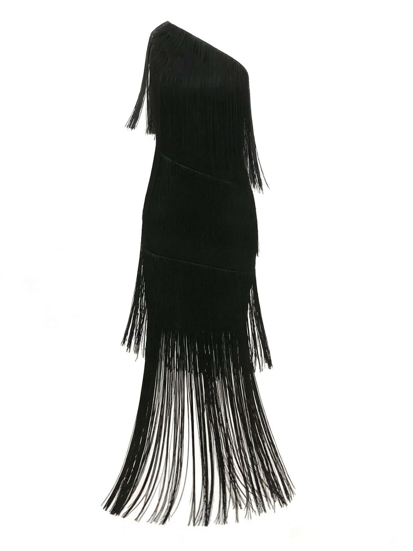 A striking black evening gown featuring fluid fringe detailing and a bold one-shoulder silhouette that moves with effortless drama. Designed to sculpt the body while creating dynamic motion, this gown delivers modern glamour with a sensual edge. Perfect for destination events, upscale soirées, and statement evenings.