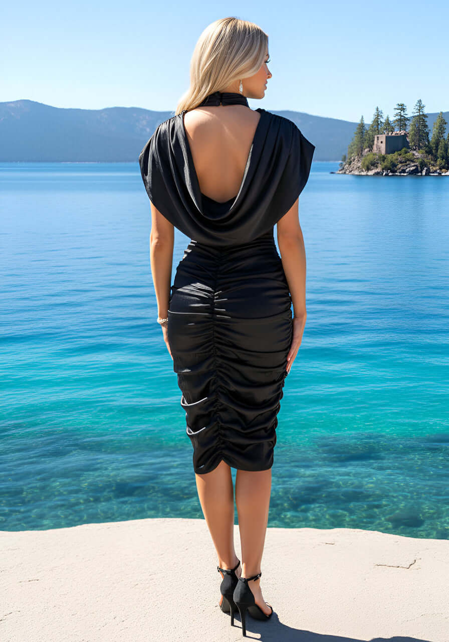Chic black ruched satin cocktail dress with sheer lace detailing and a fitted midi silhouette—perfect for parties, nights out, and special events.