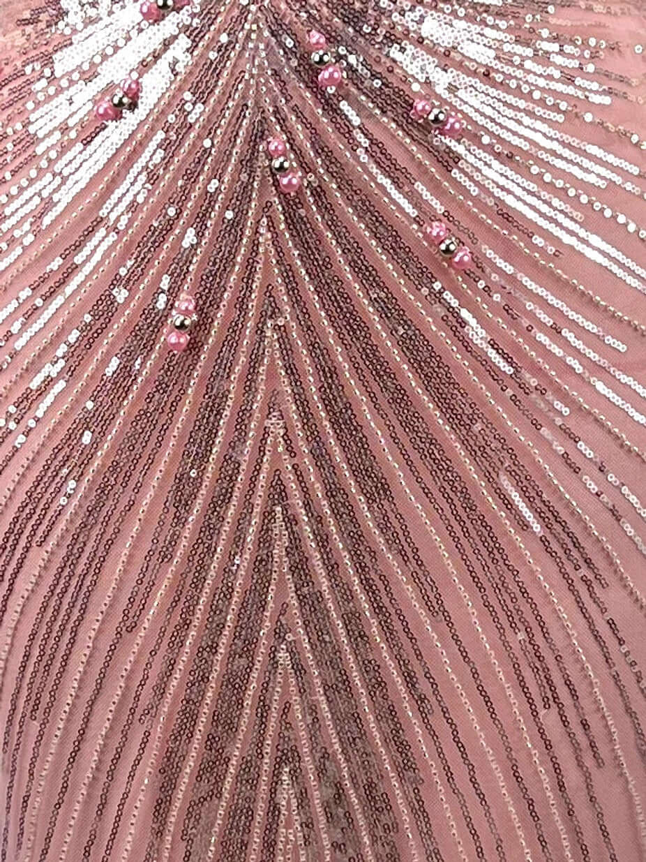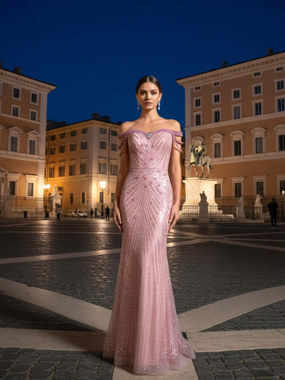 Make an unforgettable impression with this Blush Pink Beaded Off-Shoulder Evening Gown. The dress features intricate beadwork, shimmering sequin patterns, and graceful off-shoulder straps that add a touch of romantic elegance. Perfect for evening events, galas, and weddings.