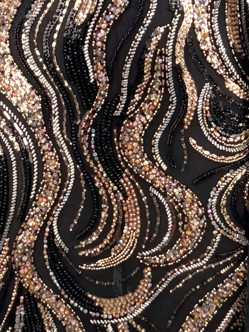 A stunning black evening gown detailed with gold crystals and sequins for a high-shine, elegant look. The one-shoulder design and flowing chiffon cape create a dramatic, red-carpet silhouette. Perfect for galas, proms, and luxury events.