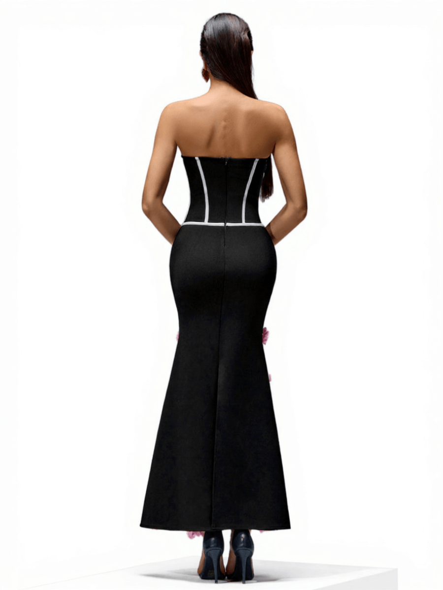 Strapless black maxi dress with white piping and pink floral accents on hem
