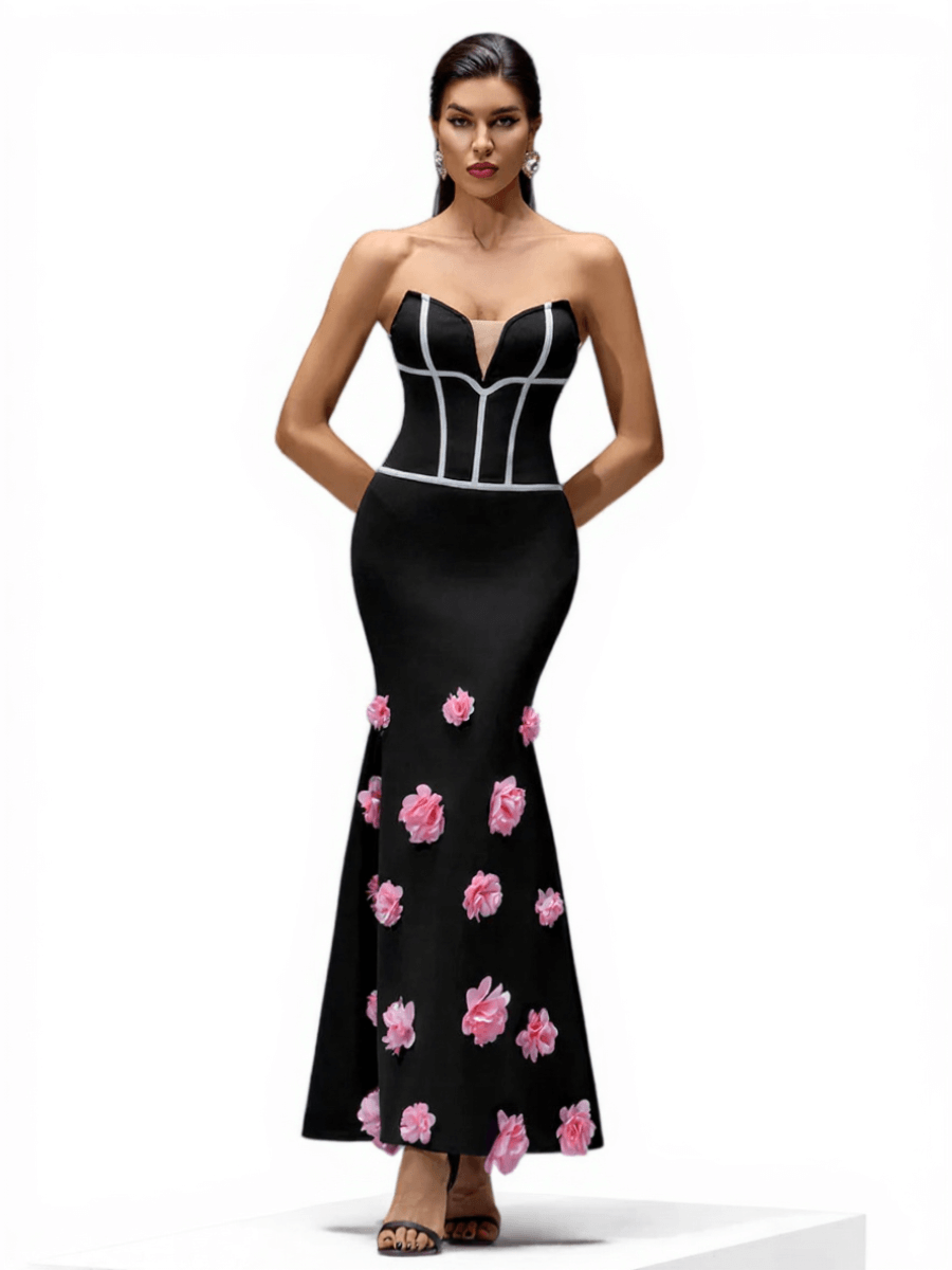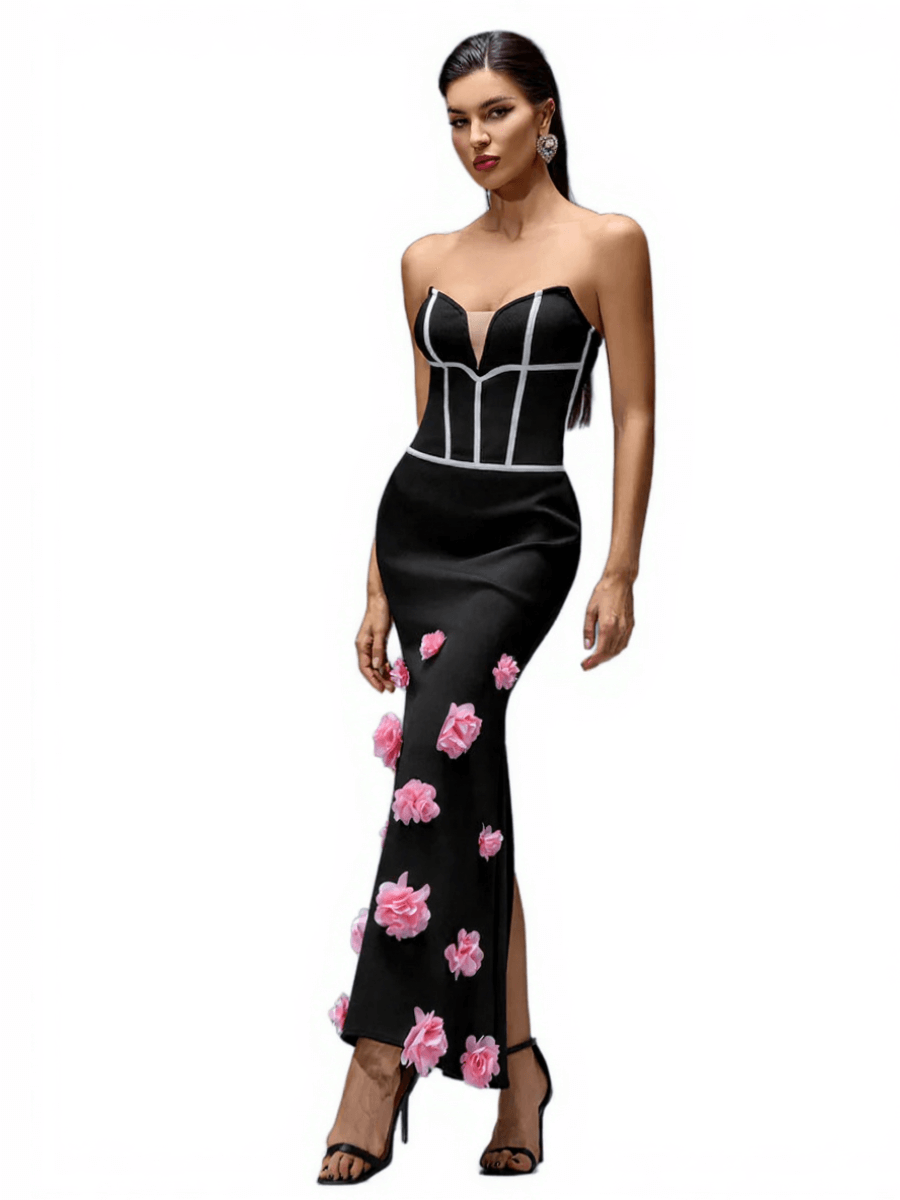 Model wearing strapless black maxi bandage dress with pink floral appliqués