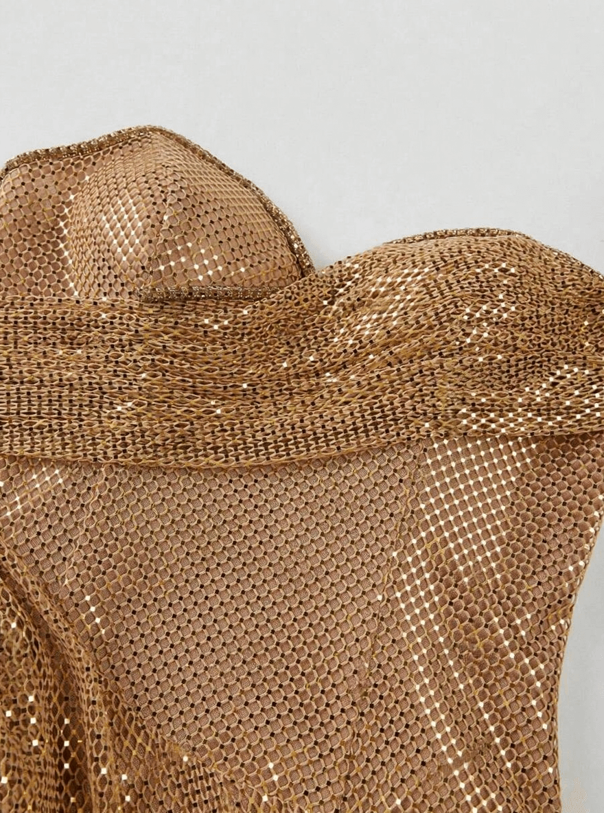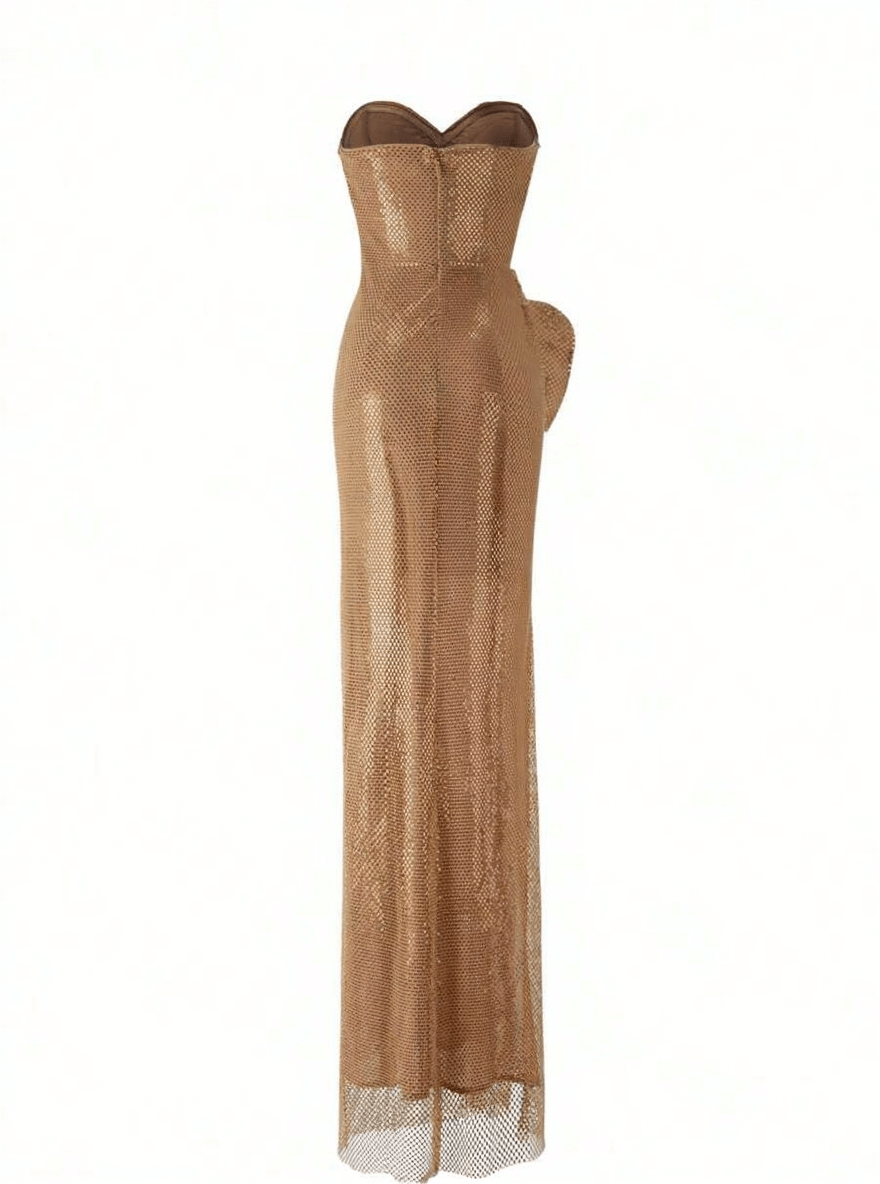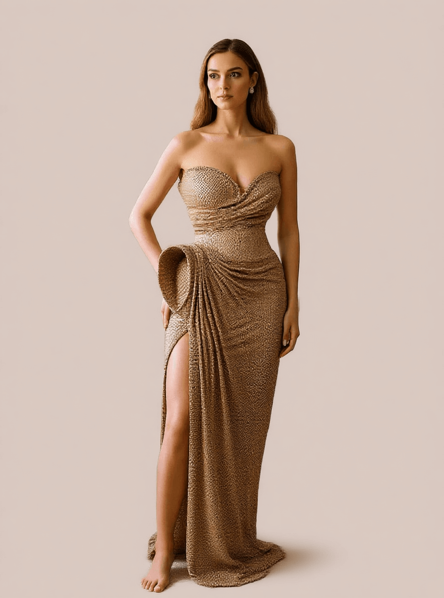 Turn heads in this stunning Evsa golden strapless evening gown, designed with a sculpted bodice and a dramatic side slit. Crafted from shimmering textured fabric, this gown accentuates your silhouette while adding timeless sophistication. Perfect for red carpet events, formal galas, weddings, and luxury parties.