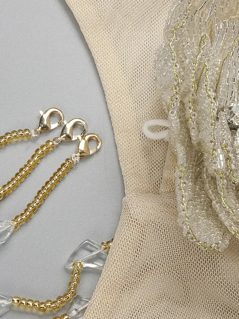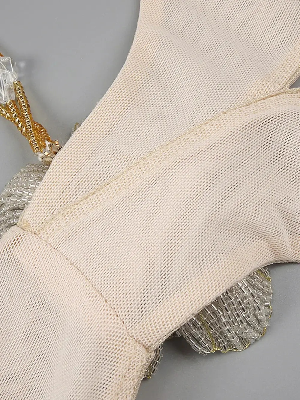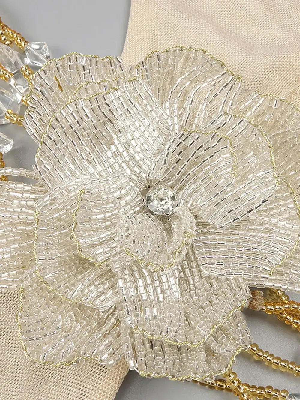 This stunning gold maxi dress features a deep halter neckline and elegant side cutouts accentuated with beaded details. The fitted silhouette and front floral embellishment create a glamorous, vacation-ready look perfect for summer evenings or beach parties.