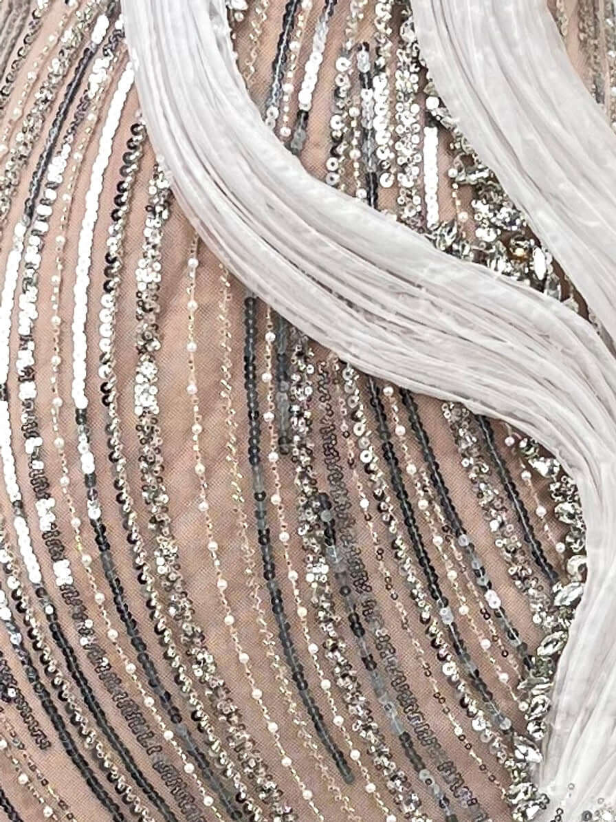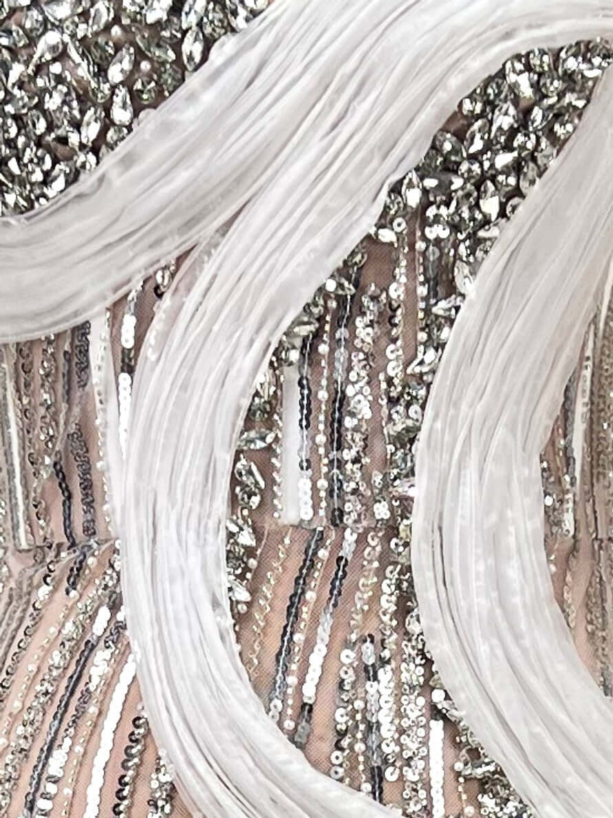 Close-up of crystal bustier on white nude sequin gown