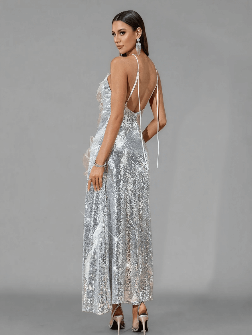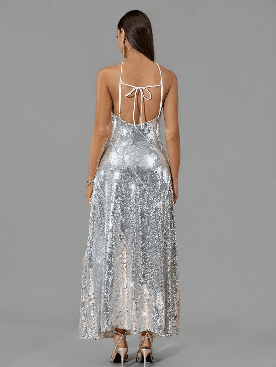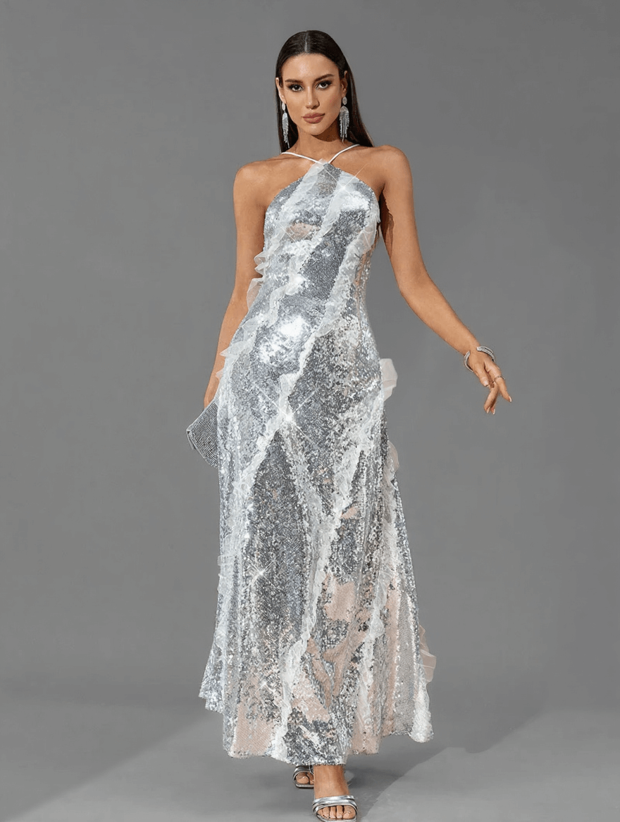 Dazzle the night away in this silver sequin halter glitter evening gown, designed with a flowing silhouette and delicate strappy back. The shimmering sequin fabric and elegant fit make it the ultimate choice for prom, galas, weddings, or glamorous red-carpet events.