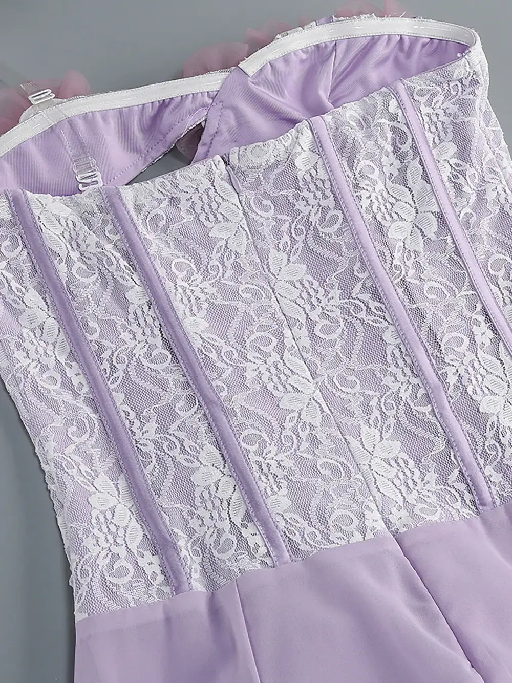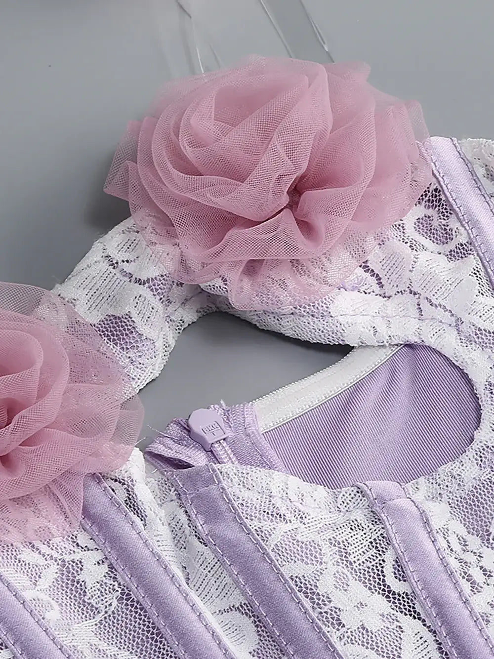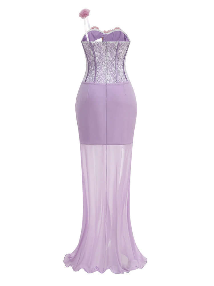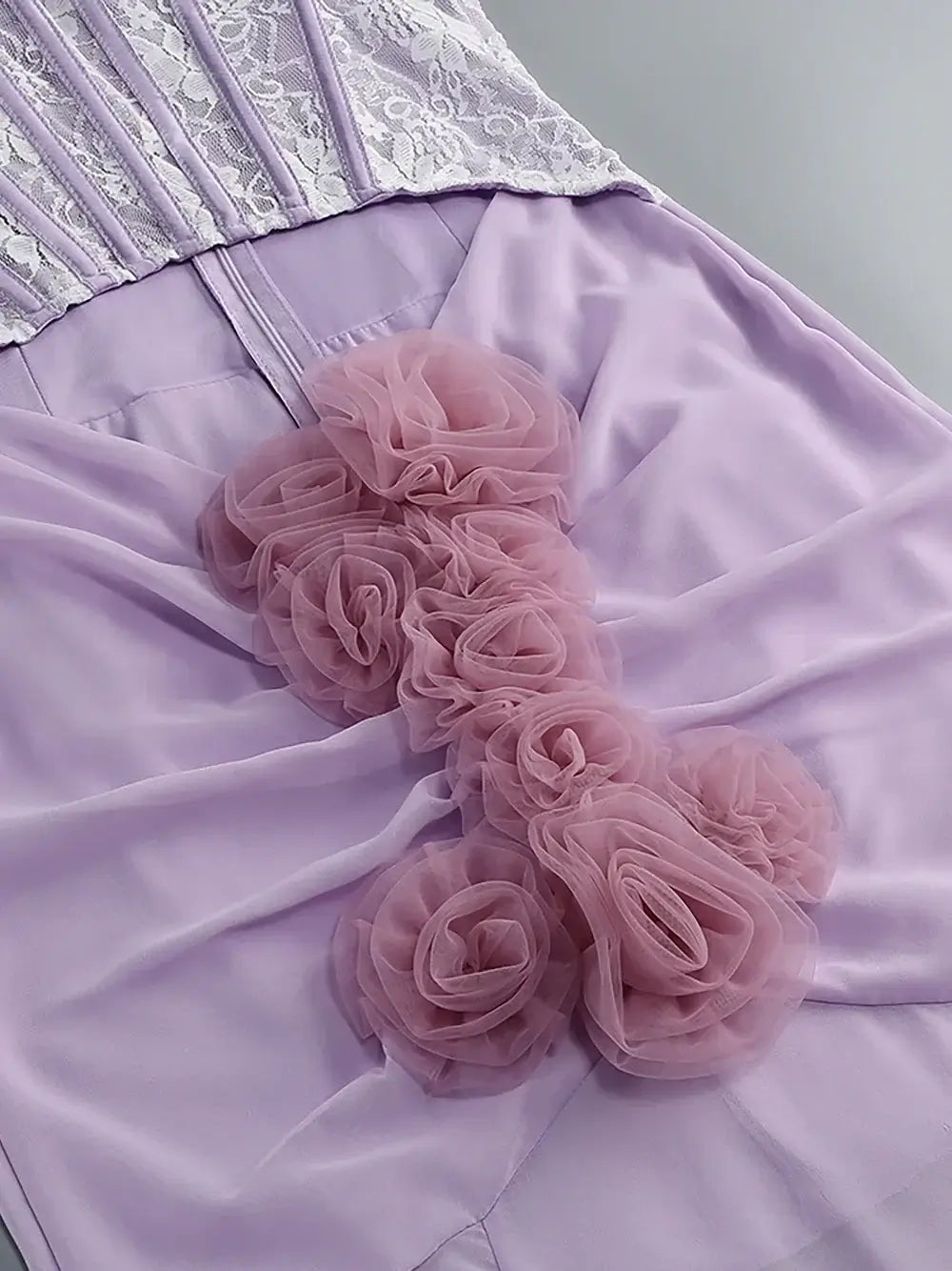 The Lilac Floral Corset Evening Gown features a structured lace corset adorned with soft rosette appliqués and a flowing high-waist maxi skirt. Designed to sculpt the waist and create a romantic silhouette, this statement two-piece gown is ideal for formal occasions, destination events, and elegant evenings. A perfect blend of couture-inspired detail and modern femininity.