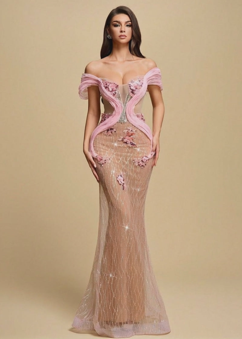 Pink off-shoulder mermaid evening gown with sheer fabric, floral embellishments and fitted silhouette