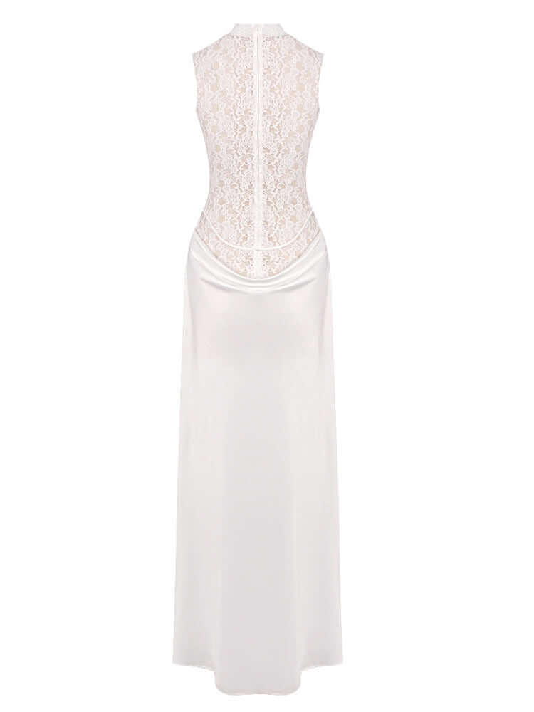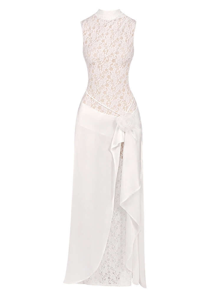 An elegant ivory column gown crafted with delicate lace and fluid draping for a refined, feminine silhouette. The high neckline and soft wrap detail create a timeless balance of romance and modern sophistication. Ideal for bridal moments, destination weddings, or elevated evening occasions.