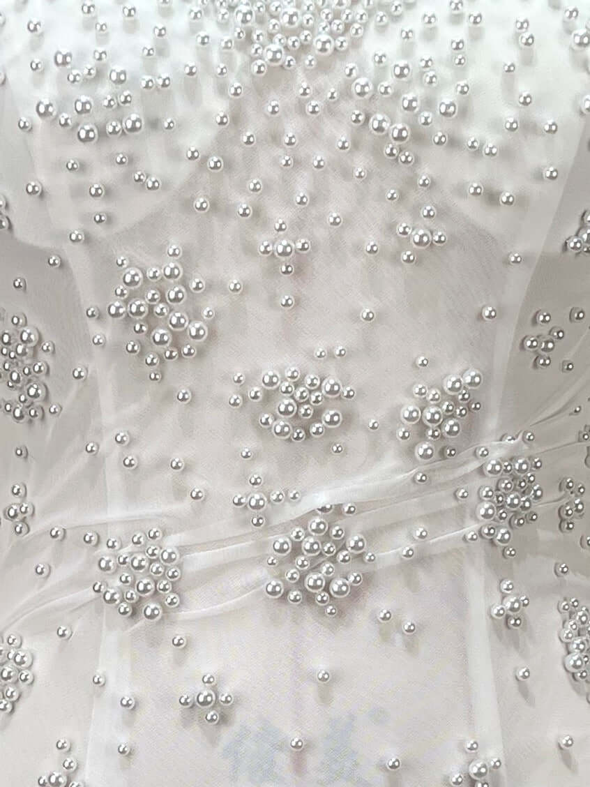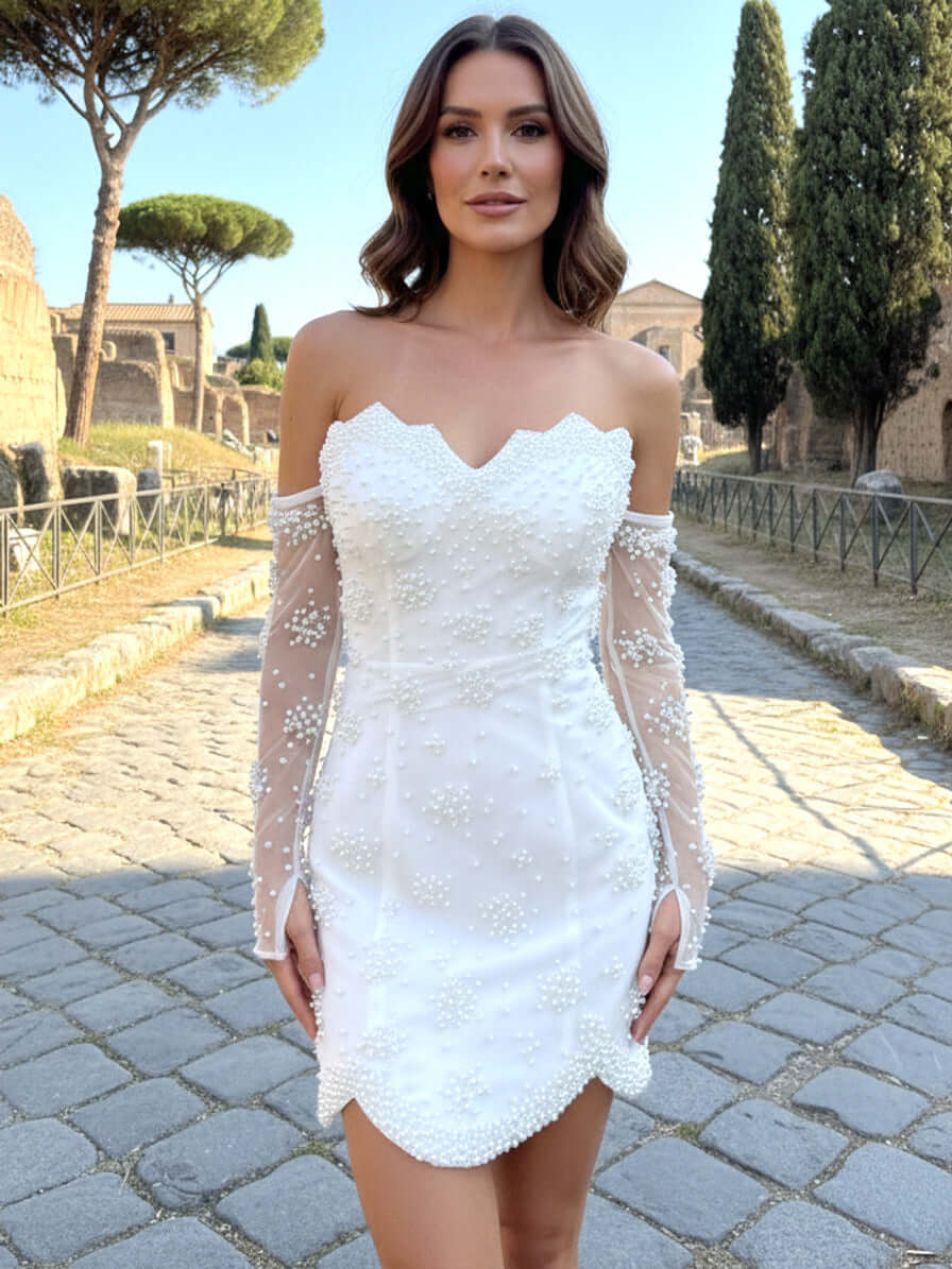 Make an unforgettable entrance in the Pearl Blossom Mini Dress, a white off-shoulder mini adorned with hand-sewn pearls and sheer tulle sleeves. Elegant, romantic, and modern — the perfect choice for engagement parties, weddings, or any special occasion.