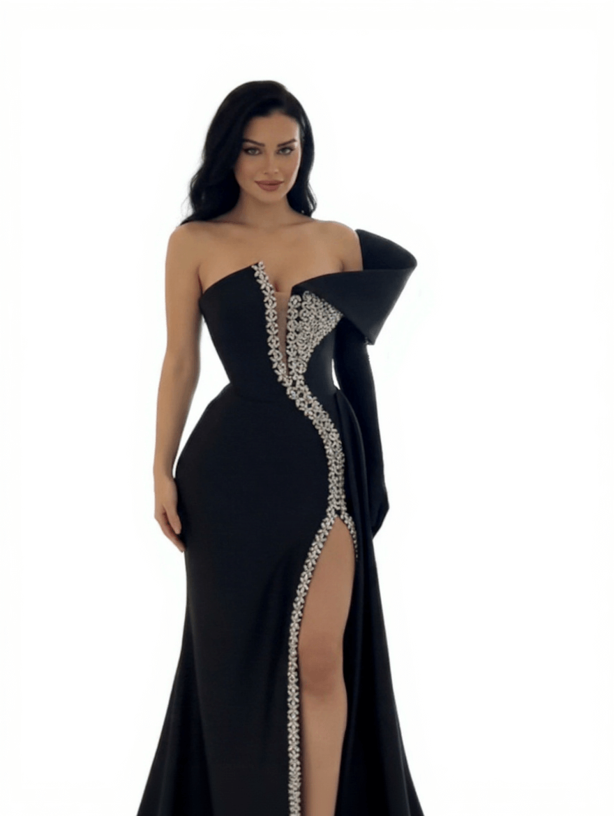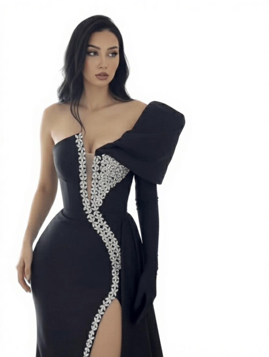 Three-quarter view of model in black one-shoulder gown with statement sleeve and crystal trim.