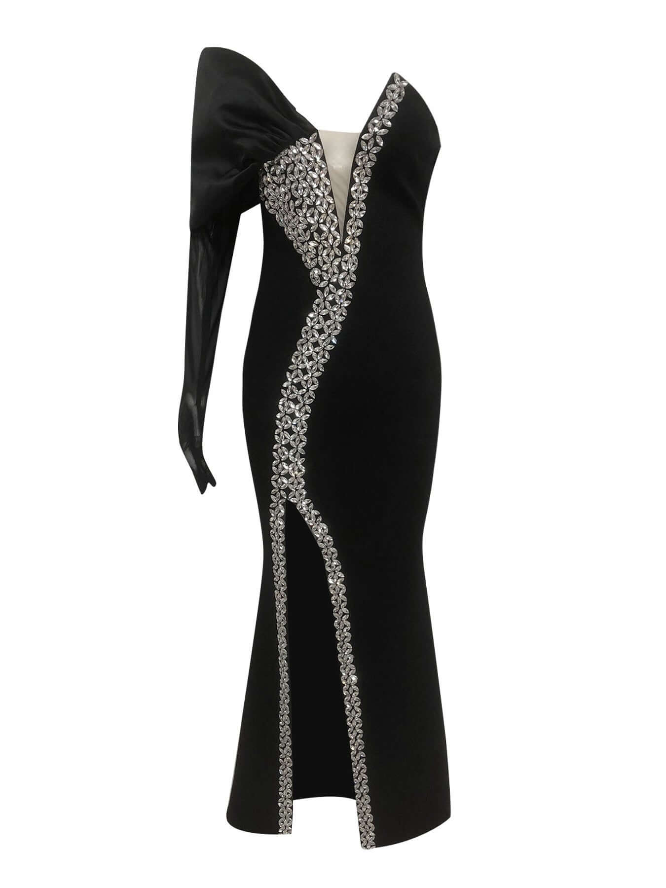 Front view of black one-shoulder crystal-trim bandage gown with front slit on mannequin.