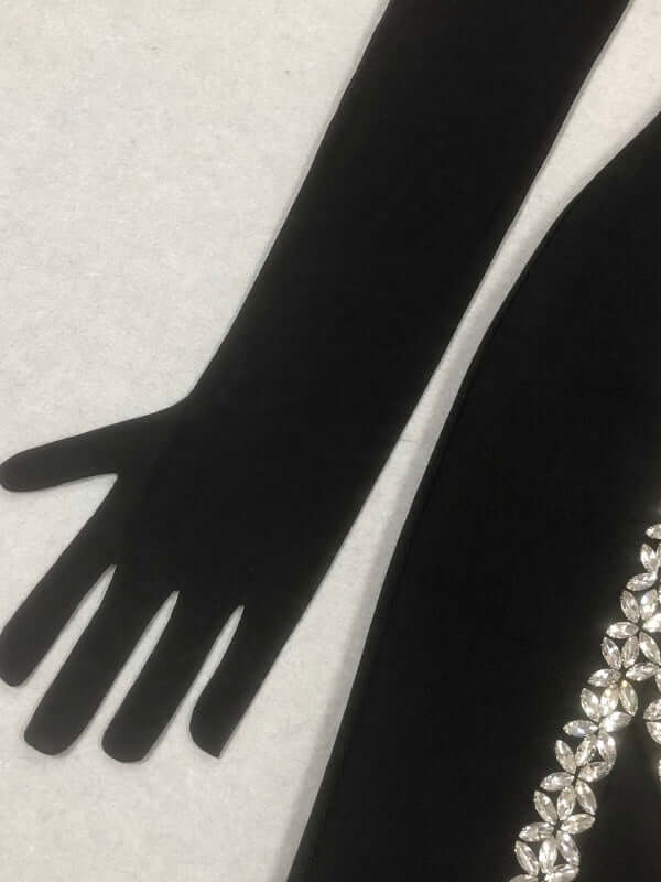Close-up of silver crystal embellishment and illusion mesh on black bandage gown.