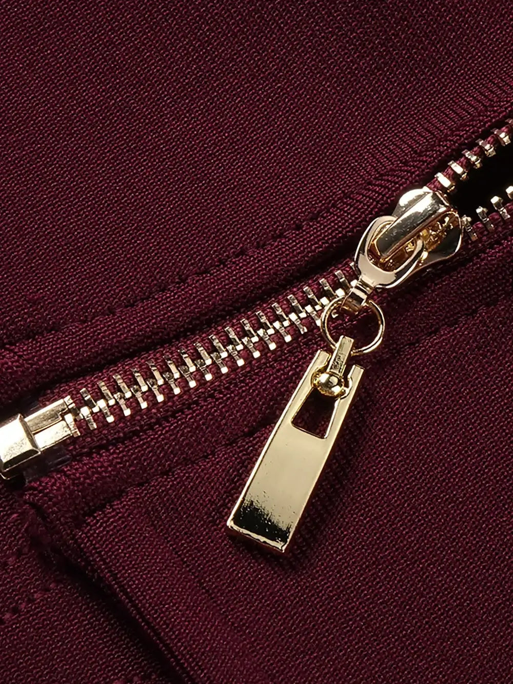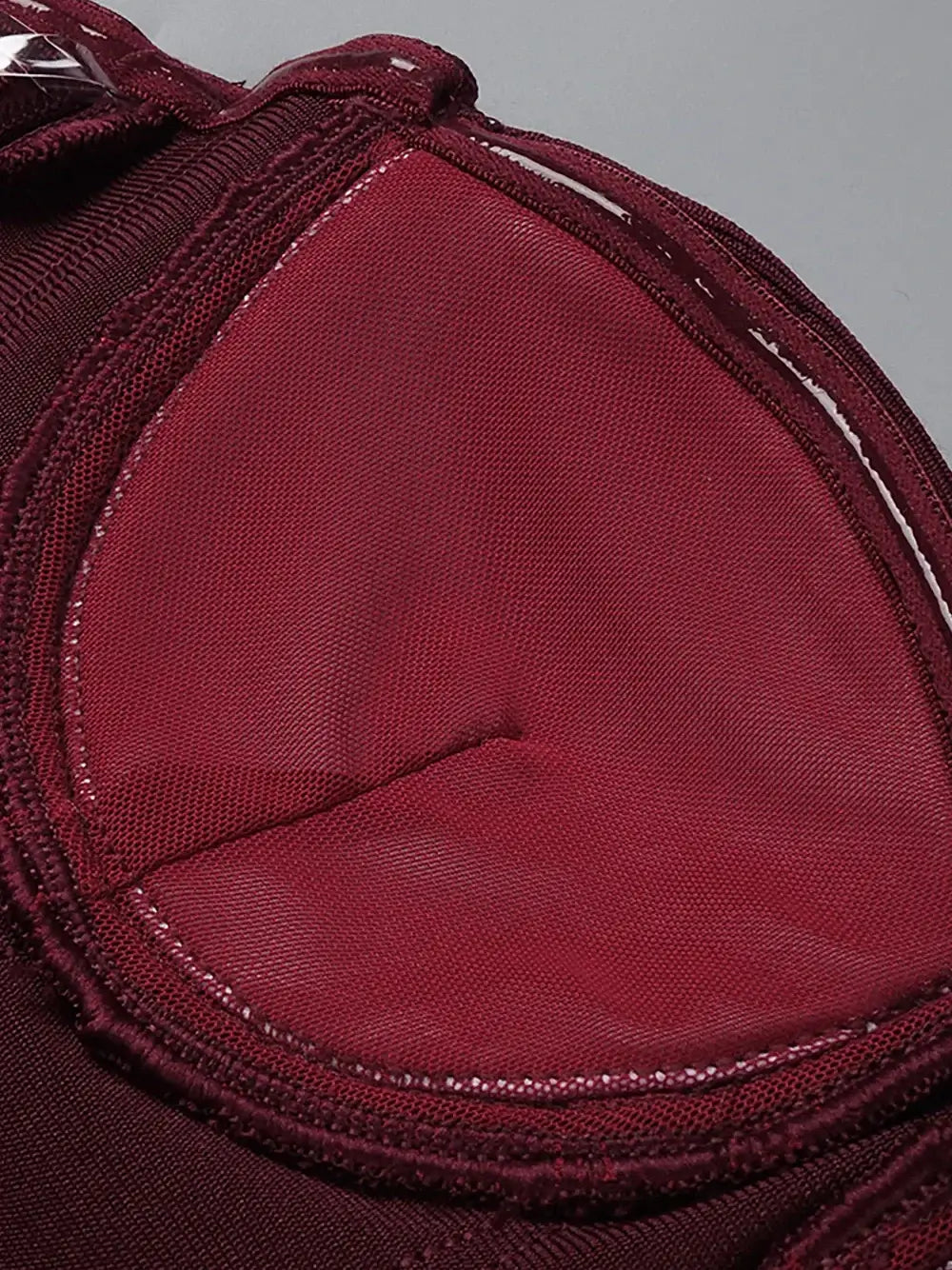 Front view of strapless burgundy corset gown with layered fringe skirt