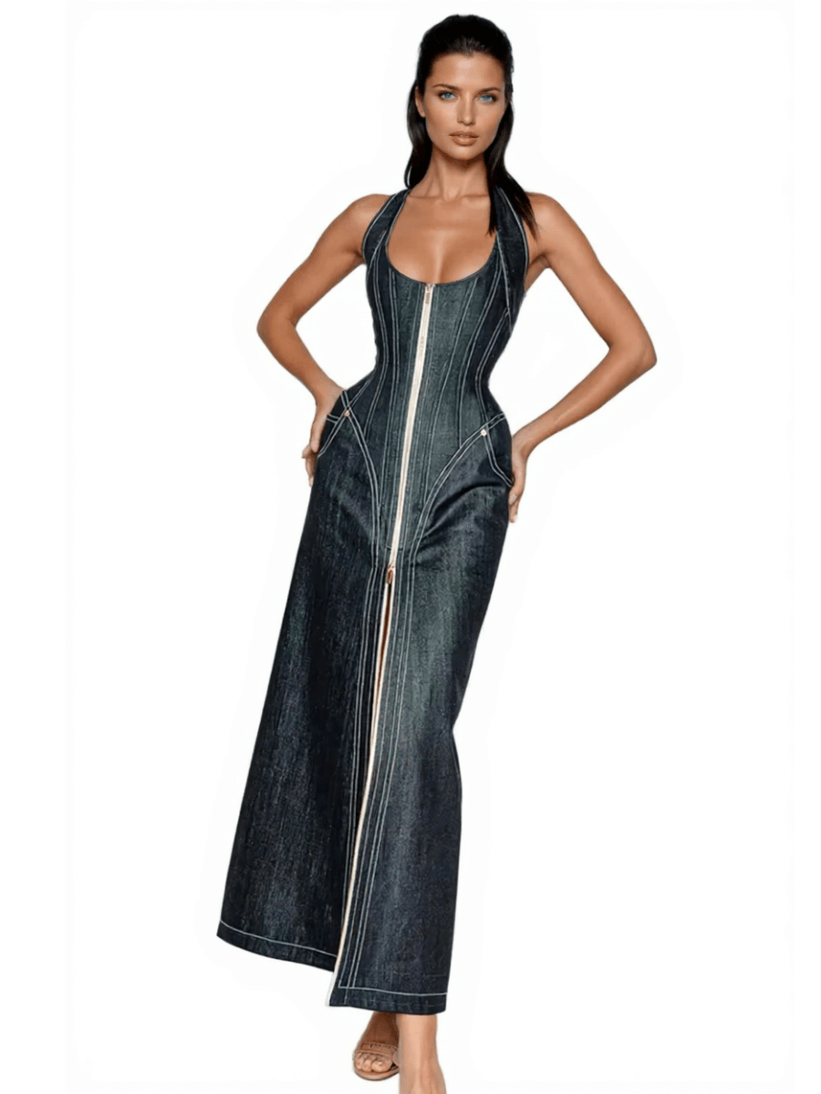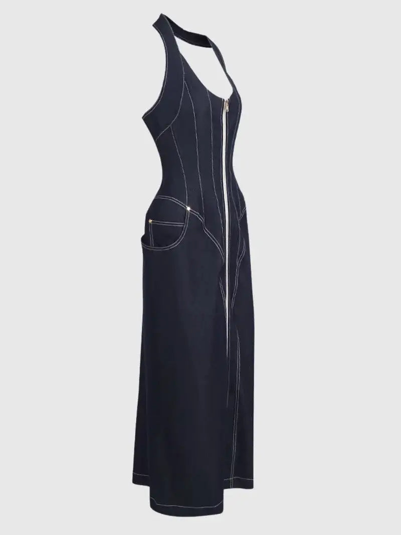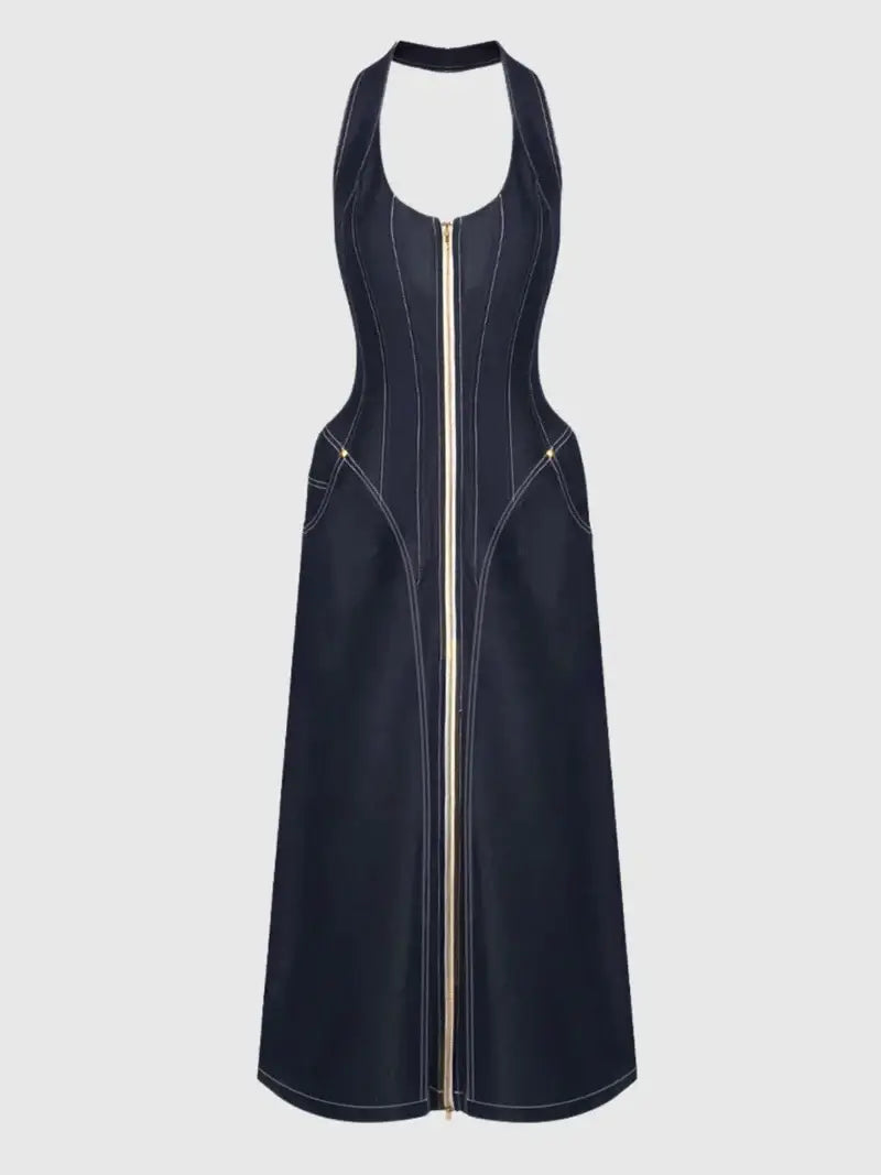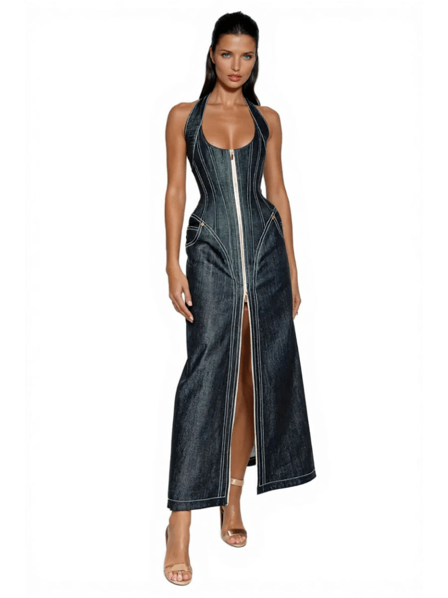 Halter neck denim maxi dress with front zip