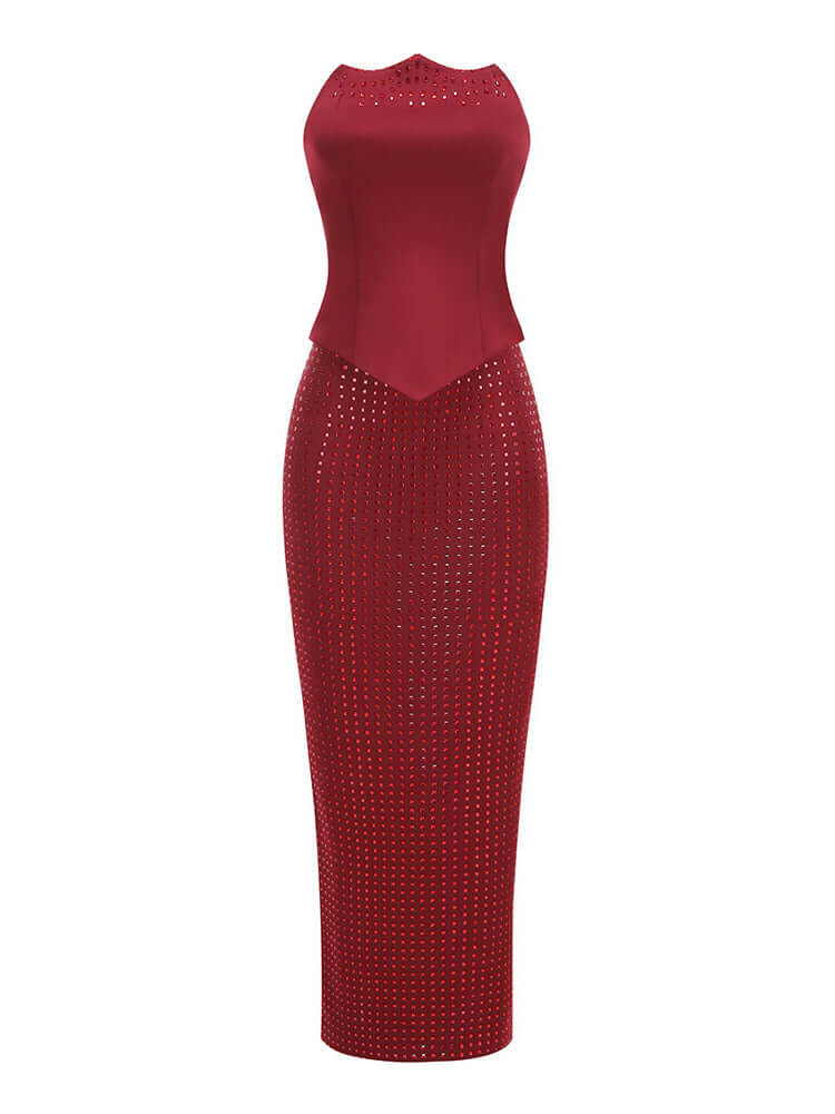 Close-up of woman in strapless crimson studded top from two-piece evening gown