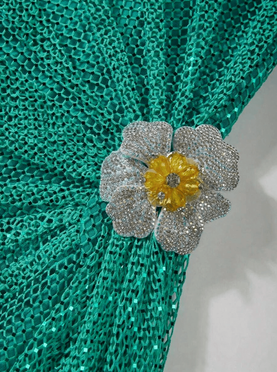 Close-up of jeweled floral embellishment on teal strapless couture gown