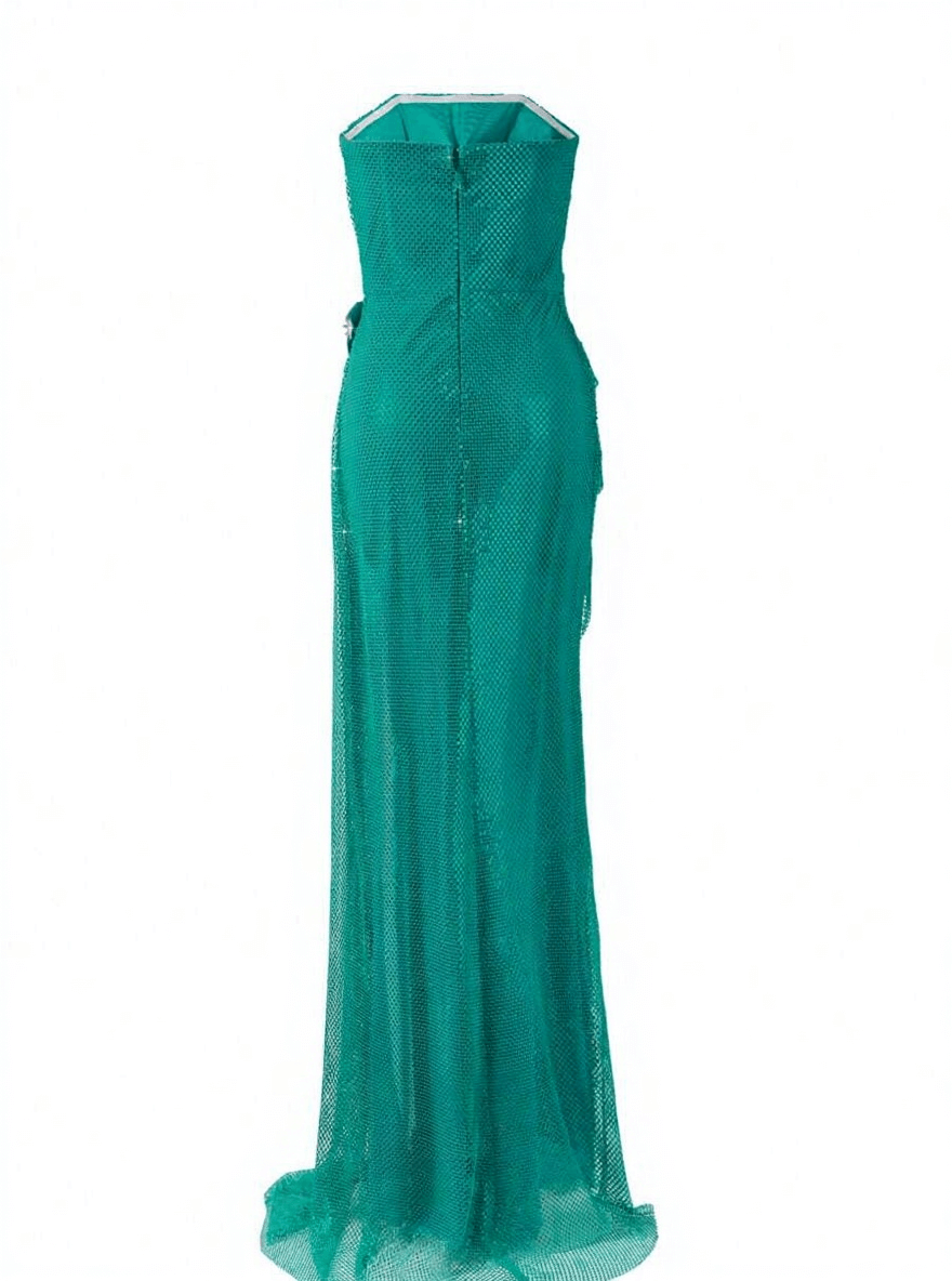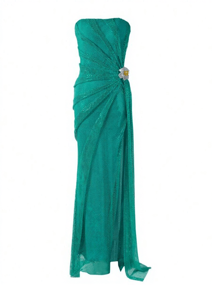 Radiate elegance in the Aqua Stardust Couture Gown, a captivating strapless evening dress in a luminous teal hue. Hand-embellished with  shimmering glitter, the sculpted silhouette flows into a dramatic side drape and daring thigh-high slit. A jeweled floral detail at the waist adds a final touch of opulence, making this gown the embodiment of luxury and allure.