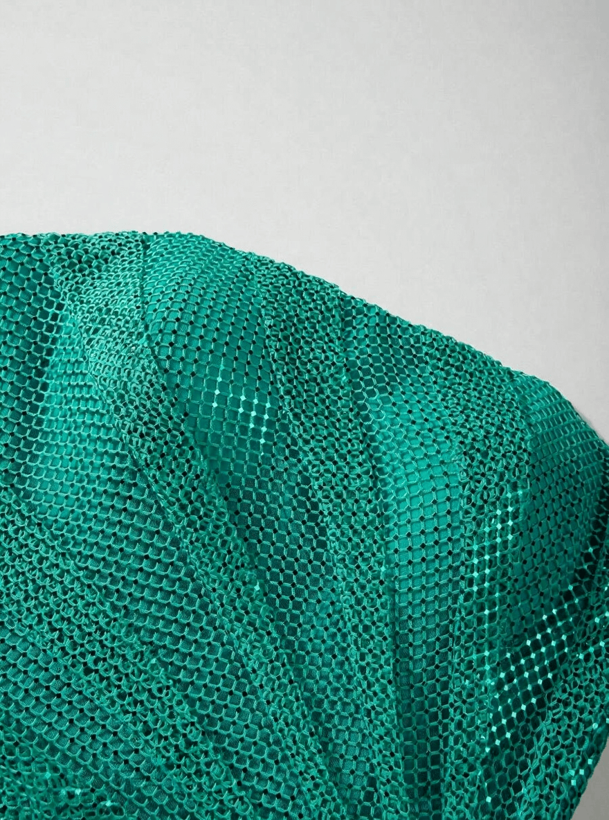 Close-up of teal glitter mesh fabric on strapless evening gown
