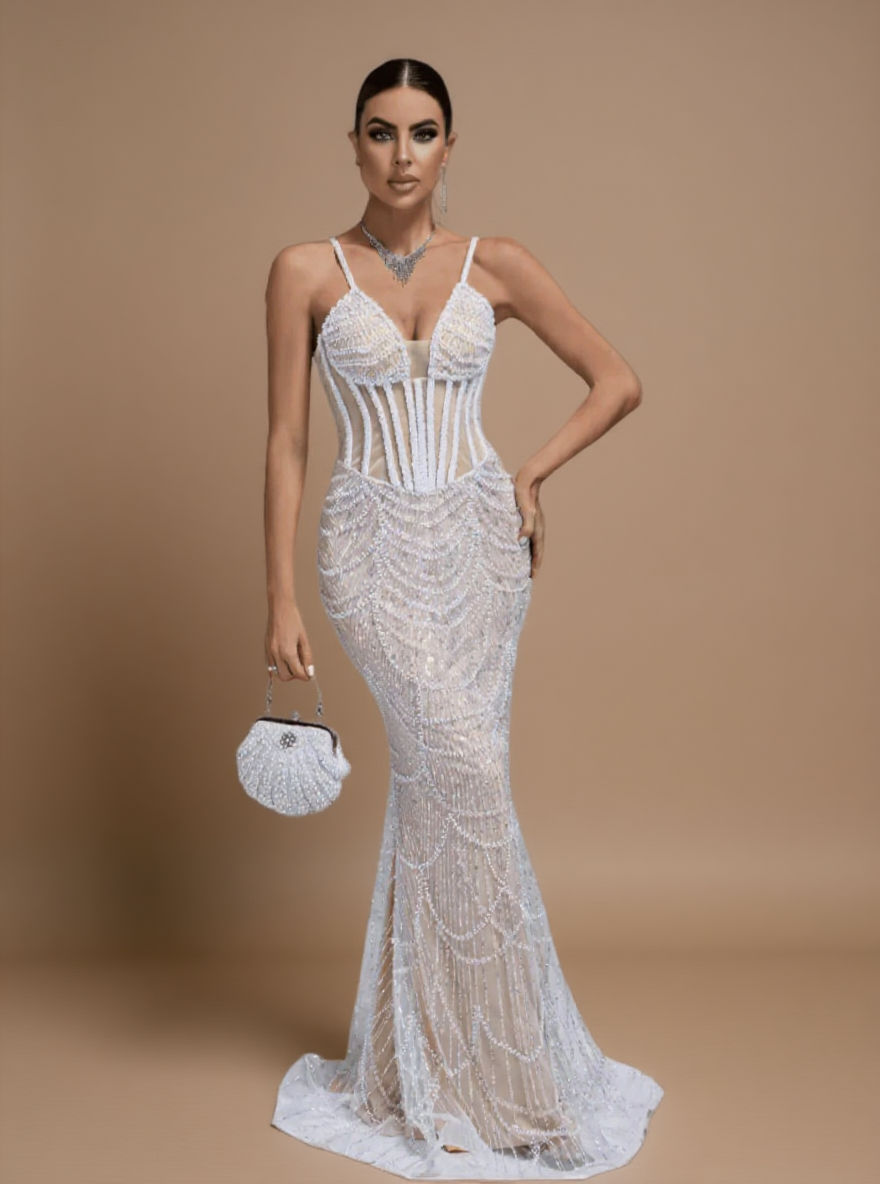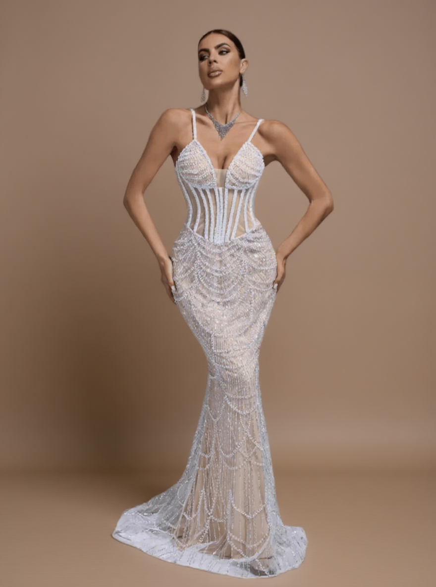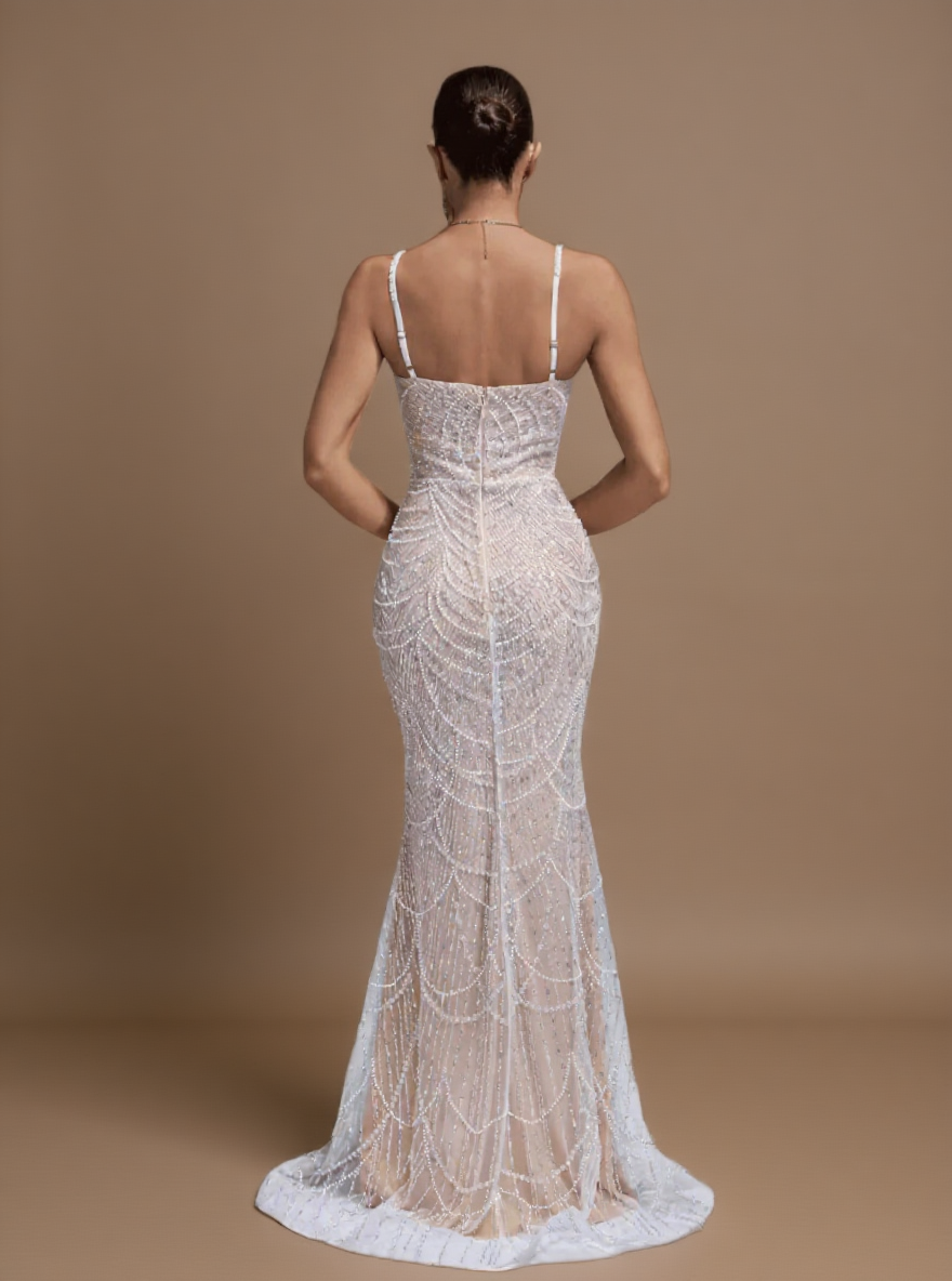 This V-neck sleeveless gown features a pearl design and spaghetti straps. The elegant and timeless design enhances your figure and adds a touch of sophistication to any special occasion. The delicate pearls and slimming silhouette make this gown a must-have for any fashion-forward individual.