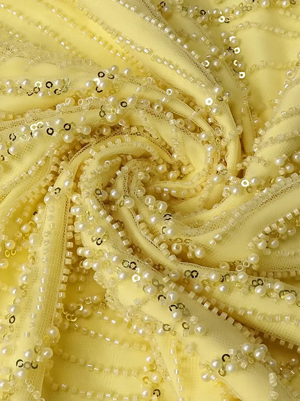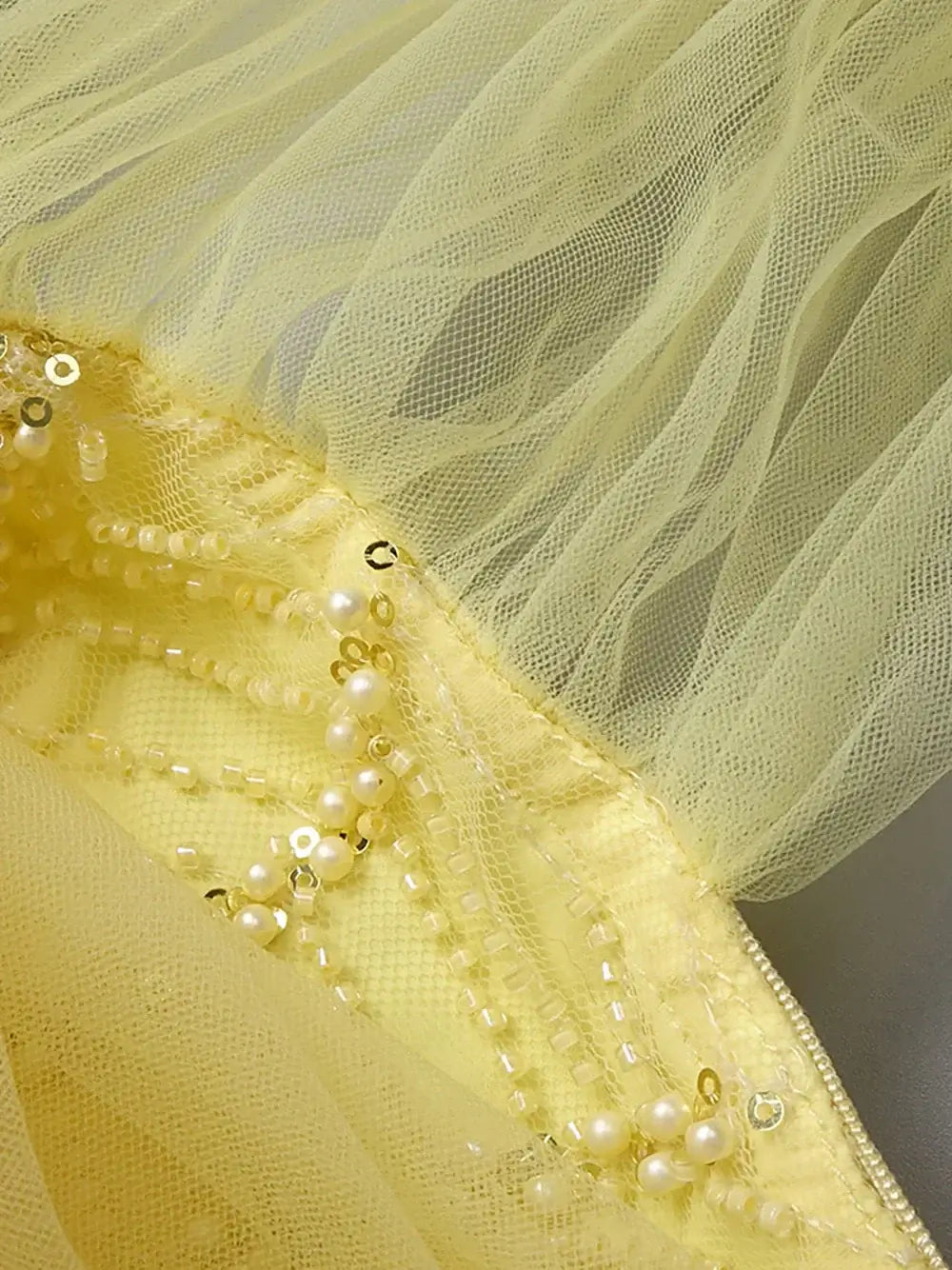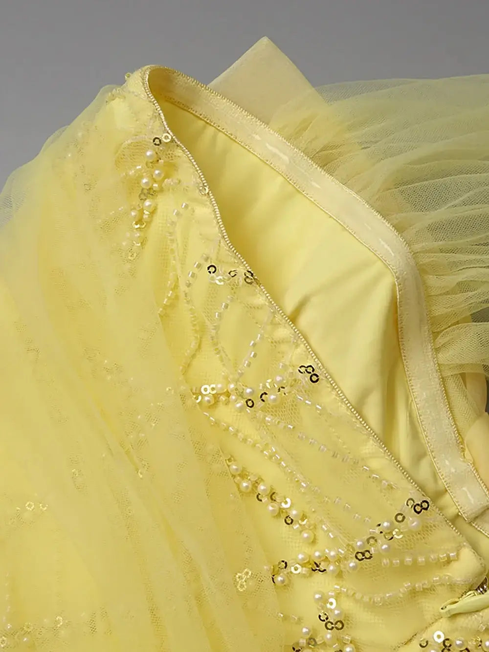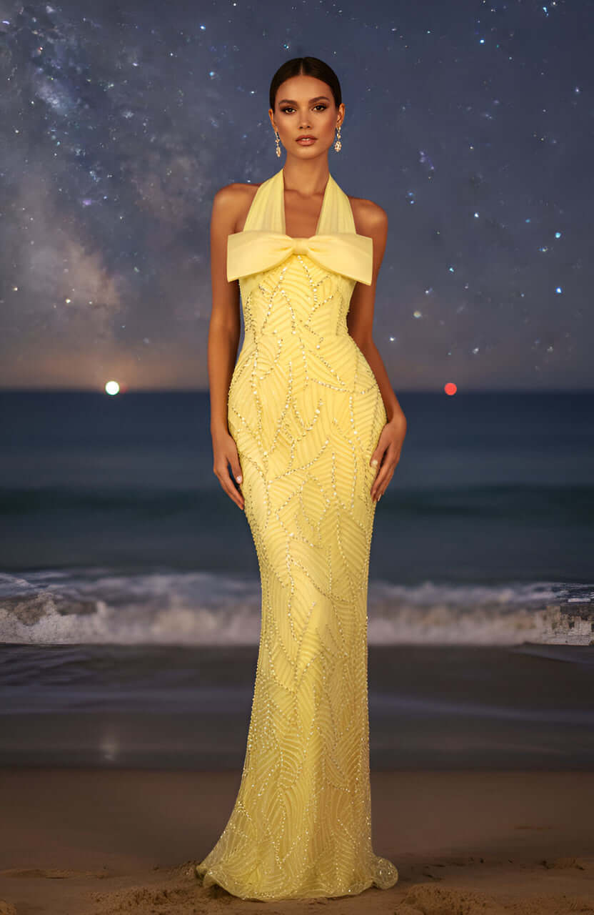 Stunning yellow halter evening gown with a statement bow and all-over beaded detailing—perfect for weddings, galas, and luxury formal events.