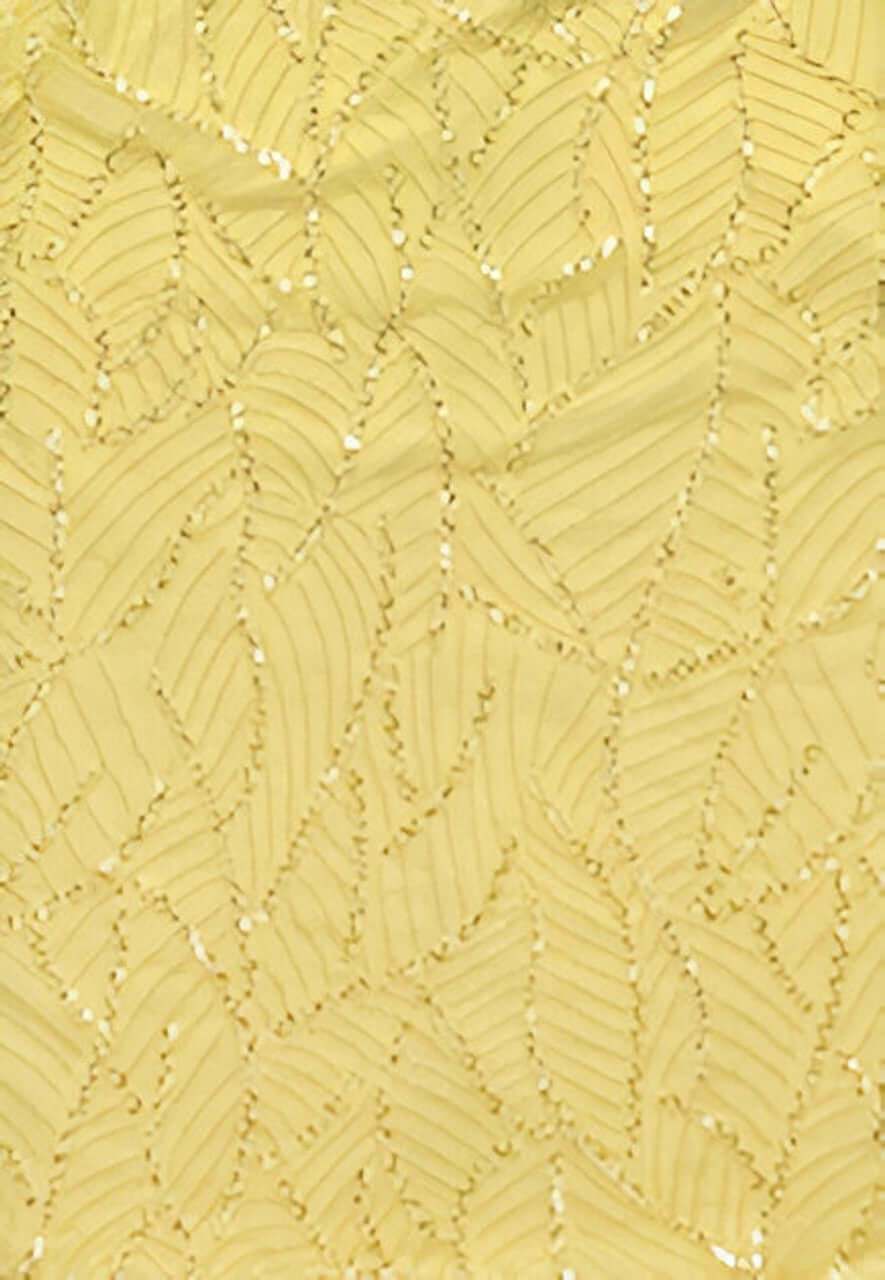 Elegant yellow halter gown with beaded pattern by the ocean at night