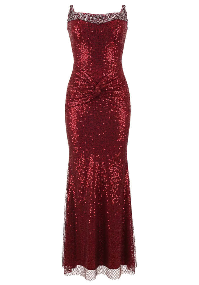 floor-length sequin dress in deep wine red color