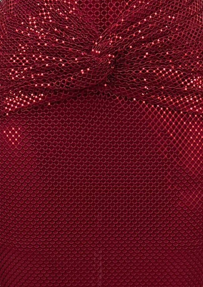 Close-up detail of burgundy sequin fabric with ruched design