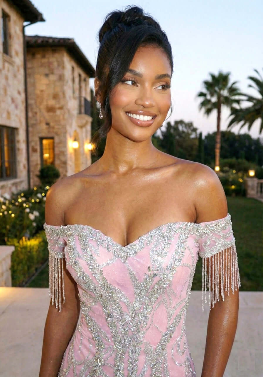 Blush Pink Off-Shoulder Sequin Gown with Crystal Fringe