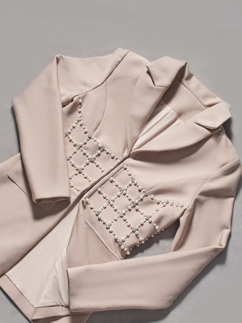 Elevate your elegance with the Beige Pearl Embellished Blazer — a chic and timeless piece adorned with pearl detailing across the front. Tailored for a flattering fit, this blazer brings a luxurious twist to classic sophistication. Perfect for formal events, business dinners, or stylish evenings out.
